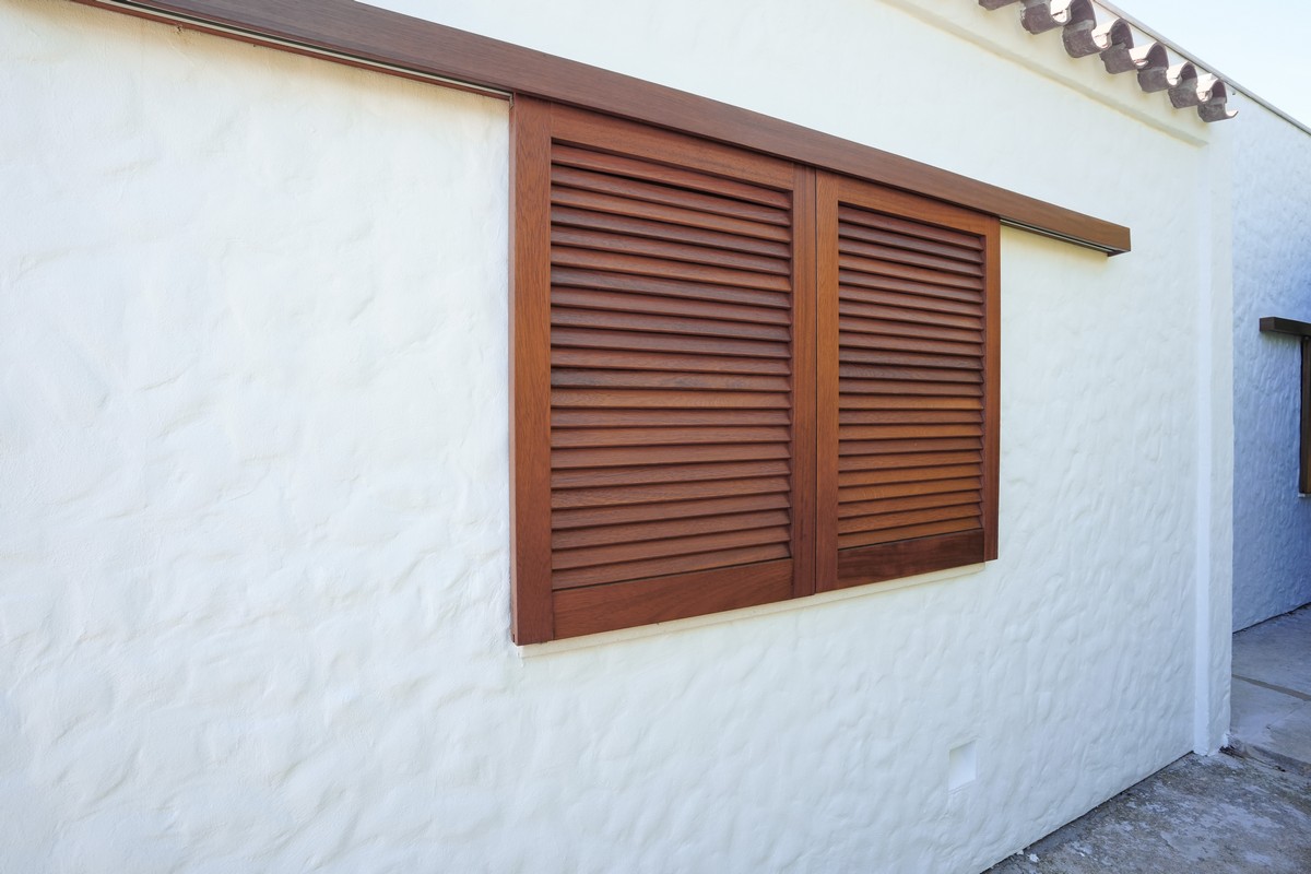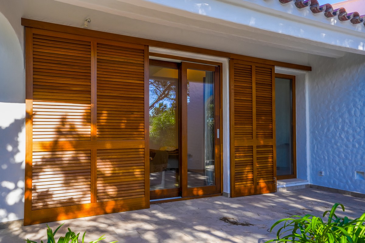 La carpintería exterior, en madera de iroko, con persianas menorquinas y cristaleras a juego, mantiene la armonía con el entorno, reforzando el carácter mediterráneo del conjunto.
